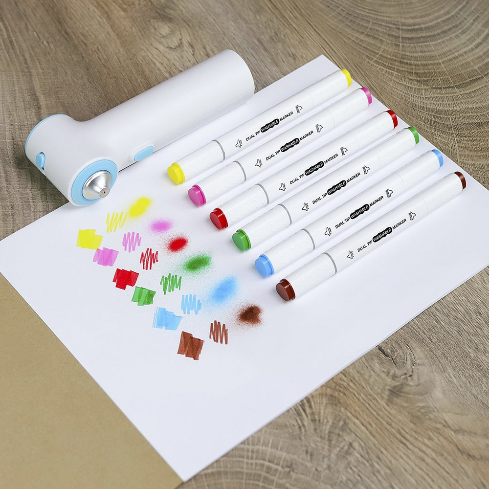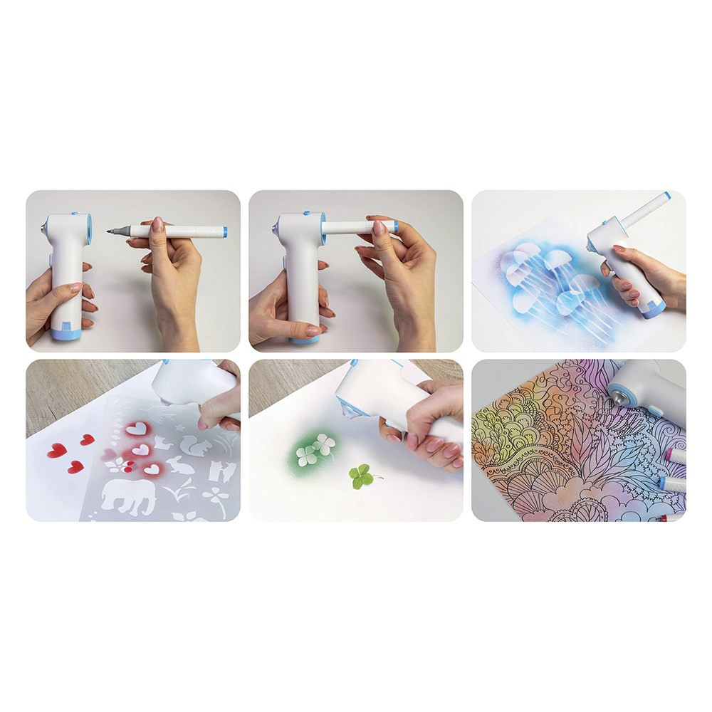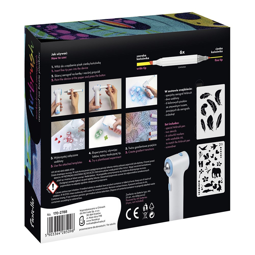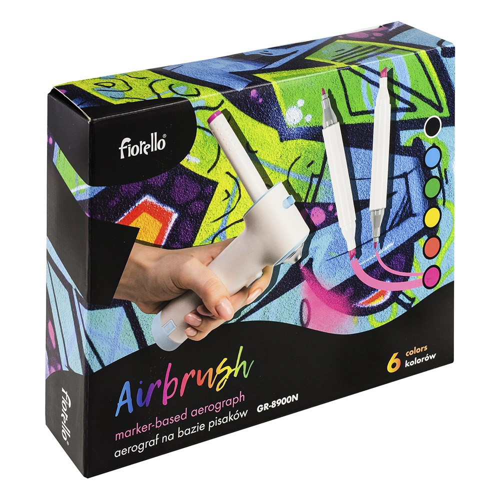 Fiorello flictoll készlet. Készlet tartalma: 1db festékszóró, 2db sablon, 6db különböző színű filctoll. Filctoll tintája mosható. Festékszóró 4db AA elemmel működik, amely nem része a készletnek.