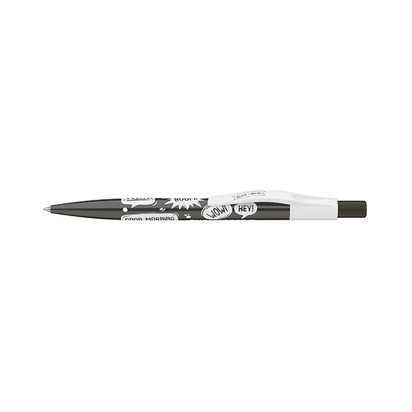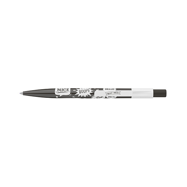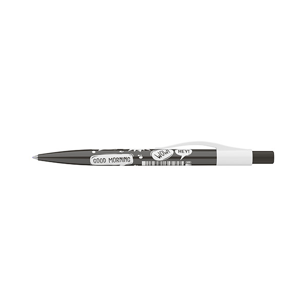 Szlogennekkel díszített nyomógombos mechanikával működő golyóstoll 0,8 mm-es kék színű golyósbetéttel.
