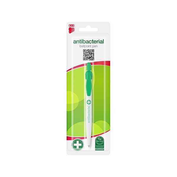 Antibakteriális golyóstoll, nyomógombos mechanikával. A műanyag alkatrészek antibakteriális védelmet adó Biomaster ezüst-ionokat tartalmaznak (biocid hatóanyag: ezüst-foszfát üveg). Az ICO Antibakteriális termékei bizonyítottan baktériumölő tulajdonsággal rendelkeznek, a felszínen megtelepedett kórokozók 24 óra leforgása alatt, 99,9% hatékonysággal elpusztulnak. Az antibakteriális hatást az angliai Industrial Microbiological Services Ltd. bevizsgálta és igazolta. Regisztrációs szám: 3264423. Vonalvastagság: 0,8 mm. Íráshossz: 2500 mm. Cserélhető betét: X-20.