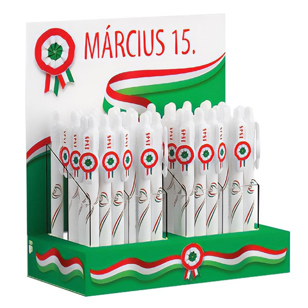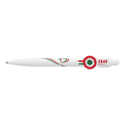 Magyar nemzeti motívumokkal díszített, nyomógombos mechanikával működő golyóstoll, 0,8 mm-es, kék színű golyósbetéttel.