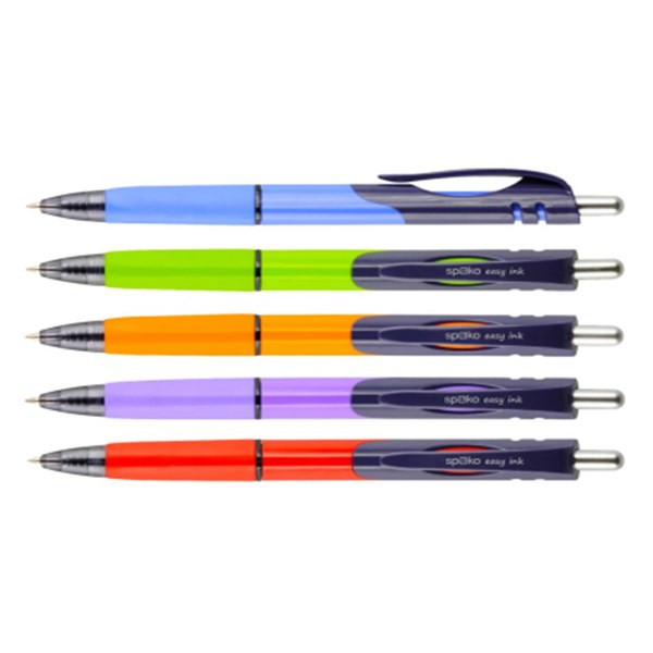 Ergonomikus háromszög testű és fogojú toll. Tartása kényelmes, fogó része gumis, és írása az alacsony viszkozitású betétnek köszönhetően könnyed.Cserélhető Spoko S0297-s golyóstoll betéttel.