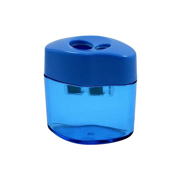 Műanyag, tartályos, fém hegyezőkéses, 2 lyukú hegyező, vastag és vékony grafit- illetve színes ceruza hegyezéséhez.