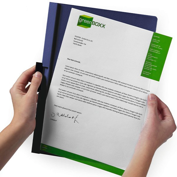 Műanyag anyagú, víztiszta előlappal, színes hátlappal, oldalán speciális elasztikus acél klippel ellátott mappa, amelyek lehetővé teszik az iratok lyukasztás nélküli lefűzését és elegáns prezentálását. A mappa maximum 30 lap lefűzésére alkalmas.