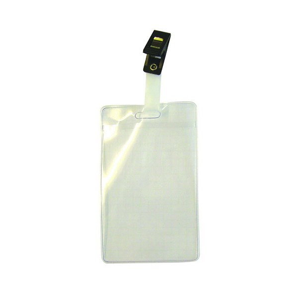 Átlátszó, lágy műanyagból készült álló formátumú névjegykitűző csiptetővel. Méret: 65 x 105 mm.