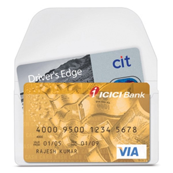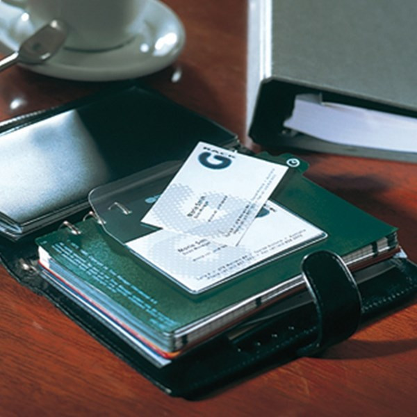 Praktikus, átlátszó, öntapadó névjegykártyatartó tok. A lehajtható fül megakadályozza a kártyák elvesztését.