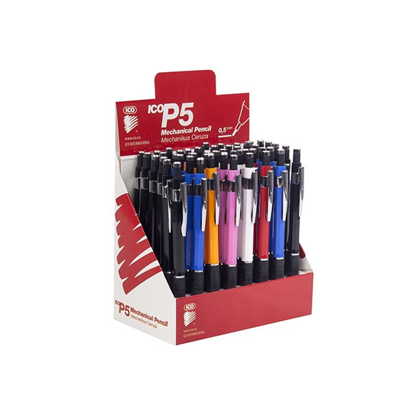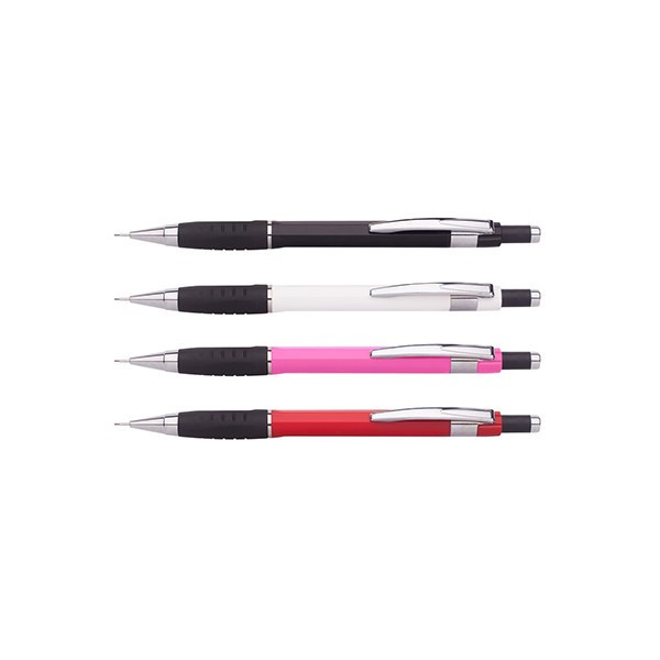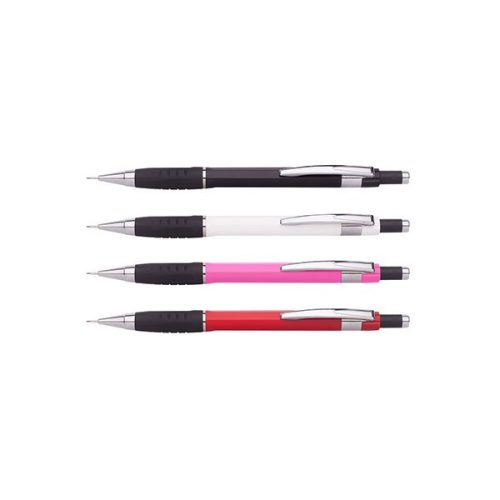 Mechanikus ceruza, 0,5 mm-es, a nyomógomb elforgatásával adagolható beépített radír, fém klipsz. Vidám, élénk színekben.