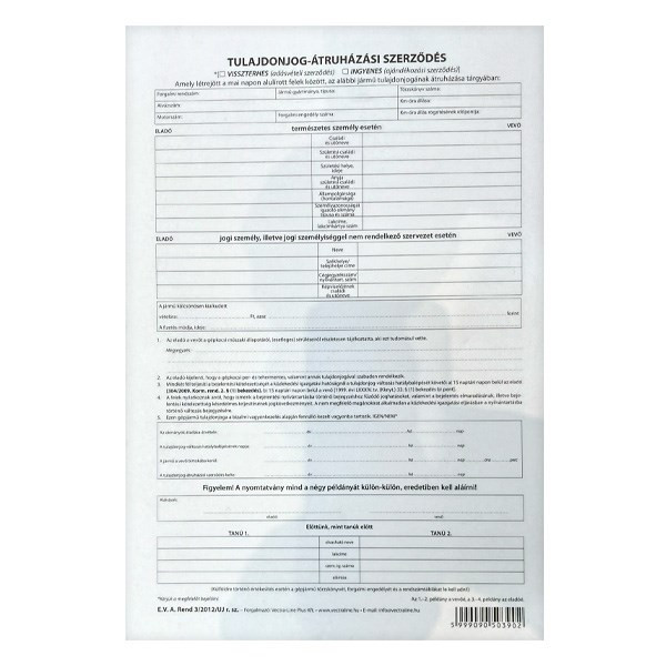Nyomtatvány adásvételi (tulajdonjog-átruházási) szerződés személygépkocsihoz VECTRALINE A/4 álló 4 példányos