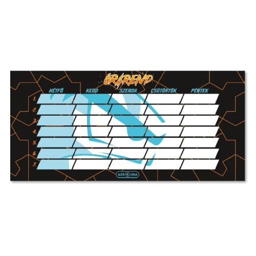 Kétoldalas, magyar nyelvű órarend A és B hét beosztással. 250 gr-os félfényes műnyomó papírra, 4 szín nyomással nyomott.