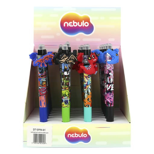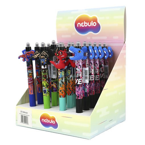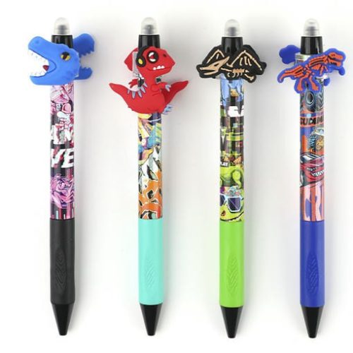 Zselés toll nyomógombbal, pörgethető figurával. Speciális tintája a tollvéggel radírozható, de az írás -18 C alatt újra megjelenik. Írásvastagság 0,7 mm. Írásszín kék.