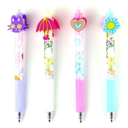 Zselés toll nyomógombbal, pörgethető figurával. Speciális tintája a tollvéggel radírozható, de az írás -18 C alatt újra megjelenik. Írásvastagság 0,7 mm. Írásszín kék.